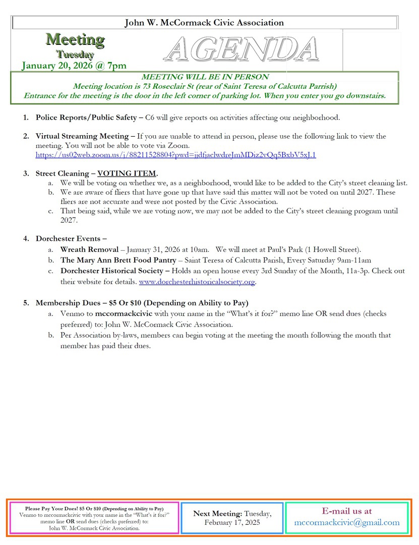 Welcome to the John W. McCormack Civic Association. The purpose of our volunteer Association is to help maintain and improve the quality of life in our North Dorchester neighborhood by working in partnership with the city government, local businesses and other community organizations to bring about civic betterment and social improvements for the good of residents and the welfare of the community.